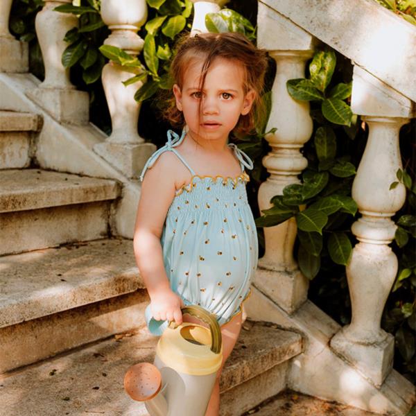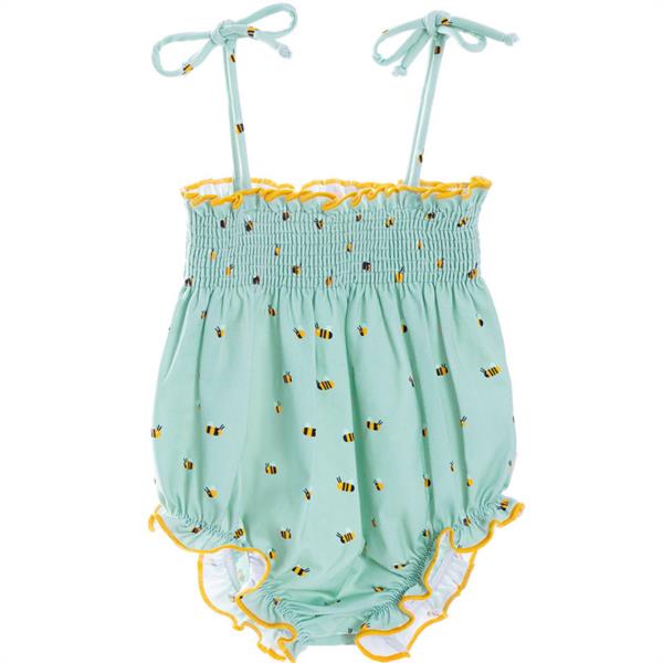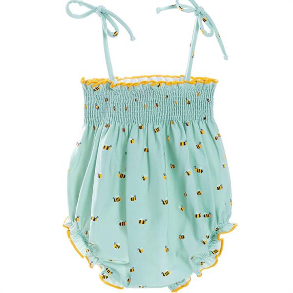 Bañador de bebé con estampado de abejas. Diseño exclusivo y propio. La parte superior con textura de nido de abeja hace que la prenda ajuste completamente al cuerpo del bebé y cree un volante con remate en contraste amarillo. Los tirantes cerrados mediante lazada, permiten la versatilidad en el ajuste de la prenda. Parte inferior elástica aporta comodidad y volumen al cuerpo del bebé.