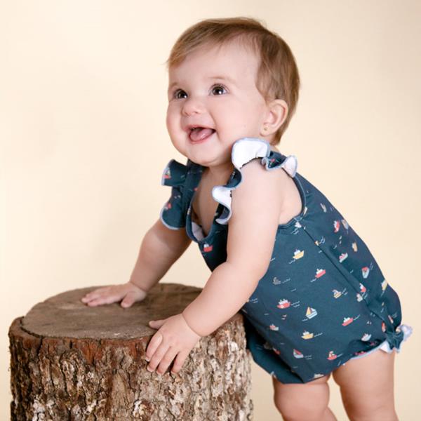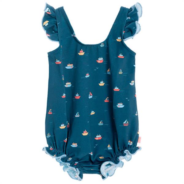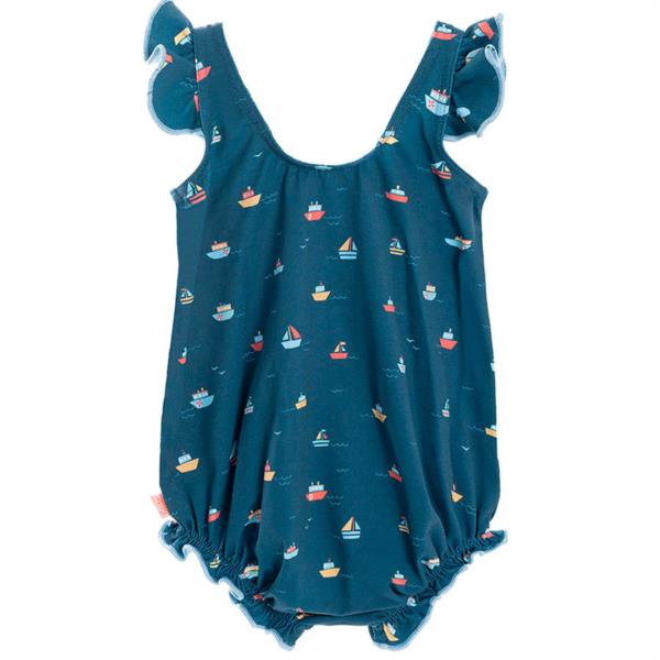 Bañador de bebé con estampado de barcos. Escotes con forma redondeada. La parte inferior con frunce elástico permiten la completa adaptación de la prenda aportando volumen a la prenda. Tirantes con detalle de volante rematado en contraste azul.