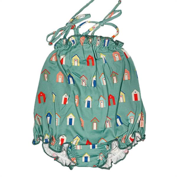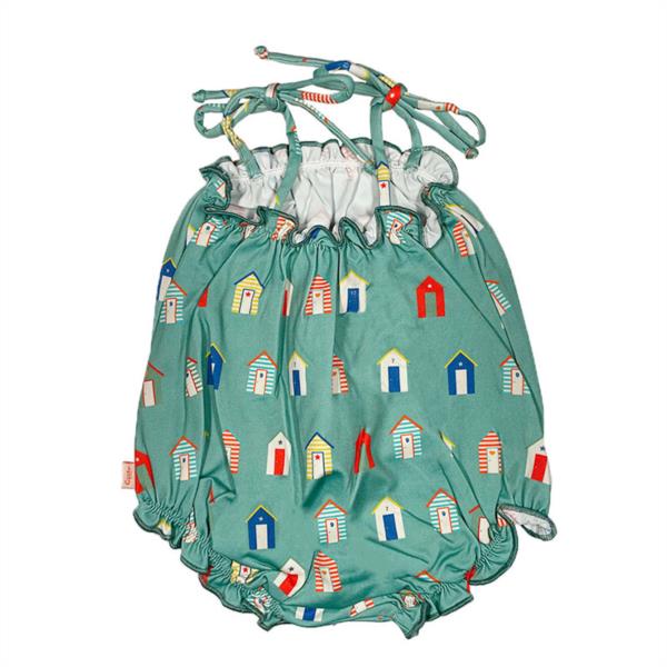 Bañador de bebé con estampado de casas de playa sobre fondo verde. Diseño exclusivo y propio. El fruncido superior crea un volante rematado en naranja. Los tirantes cerrados mediante lazada, permiten la versatilidad en el ajuste de la prenda. Parte inferior elástica y con volantes aporta comodidad y volumen al cuerpo del bebé.